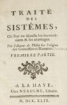 [CONDILLAC (Étienne Bonnot de)]. Traité des sistêmes [sic], Où l'on démêle les inconvéniens & les avantages. La Haye, Neaulme, 1749. 2 volumes in-12, veau marbré, filet à froid, dos orné, pièce de titre rouge, tranches marbrées (Reliure...