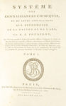 FOURCROY (Antoine-François). Systèmes des connaissances chimiques, et de leurs applications aux phénomènes de la nature et de l'art. Paris, Baudoin, An IX. 5 volumes in-4 et un atlas comprenant 9 tableaux dépliants, basane racine, dos orné,...