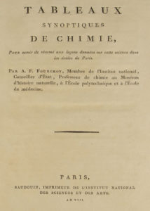 FOURCROY (Antoine-François). Tableaux synoptiques de chimie, pour servir de résumé aux leçons données sur cette science dans les écoles de Paris. Paris, Baudoin, An VIII. In-folio, cartonnage de l'époque. Duveen, p. 226. - Ferguson, I, p. 287....