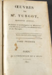 coins de vélin vert, dos lisse orné, pièces de titre rouge et de tomaison orangée, tranches jaunes mouchetées de rouge (Reliure de l'époque). Première édition collectivedes œuvres de Turgot (1727-1781), économiste et ancien contrôleur général des finances de Louis XVI. (Einaudi, n°5769.) Mise en œuvre et annotée par Dupont de Nemours, elle est ornée d'un portrait de Turgot gravé sur cuivre par Tardieu d'après Ducreux. Étiquette ex-libris de E. Larnac avocat. Quelques légères rousseurs, dos un peu secs.