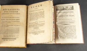 avantages qu'elle leur procure, les maux dont elle les délivre [...]. Ou Lettre familière aux Laboureurs de Bretagne. Rennes, Vatar, 30 mai 1790. In-8, bradel demi-maroquin bordeaux (Reliure moderne).Diffusion populaire des idées de la Révolution (INED, n°2820). - [BONCERF]. La Plus importante et la plus pressante affaire, ou la nécessité et les moyens de restaurer l'agriculture et le commerce. S.l.n.d. In-8, bradel demi-maroquin bordeaux (Reliure moderne).L'auteur demande le rétablissement de l'agriculture, et condamne en passant le luxe et le célibat (INED, n°610). - GOSSELIN (Charles-Robert). Réflexions d'un citoyen adressées aux notables sur la question proposée par un grand roi : En quoi consiste le bonheur des peuples & quels sont les moyens de le procurer? S.l.n.n., 1787. In-8, demi-basane fauve (Reliure du début du XXe siècle).Édition originale de cet écrit d'un précurseur du socialisme agraire (INED, n°2072 ; Lichtenberger, Le Socialisme utopique, pp. 132-160).