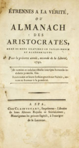 ALMANACH. - Étrennes à la Vérité, ou Almanach des aristocrates. À Spa, chez Clairvoyant, 1790. Plaquette in-8 de 80 pages, demi-basane violette (Reliure du XIXe siècle). Pamphlet orné de 2 gravures, dont l'une représente un monstre à quatre...