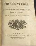mouchetées de rouge (Reliure de l'époque). Édition originale, ornée d'un plan gravé de la Salle des notables à la clôture de l'Assemblée. Procès-verbal de la seconde assemblée de notables convoquée par Louis XVI en 1788 pour l'organisation des États généraux et pour décider de la question du doublement du tiers état et du vote par tête ou par ordre. Habiles restaurations aux mors, sinon bel exemplaire.