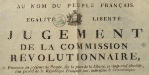 de l'Imprimerie de la Commission temporaire, s.d. [1794]. Placard in-folio (52,5 x 40 cm), une feuille pliée. Très rare placard annonçant la condamnation à mort de 23 civils de Commune-affranchie ou du département du Rhône, jugement rendu par la Commission révolutionnaire le 29 pluviôse an II (17 février 1794). La Commission révolutionnaire établie à Commune-affranchie, par les Réprésentants du Peuple, considérant qu'il est instant de purger la France des rebelles à la volonté nationale ; de ces hommes qui convoquèrent & protégèrent à main armée le congrès départemental de Rhône & Loire ; de ces hommes qui portèrent les armes contre leur patrie, égorgèrent ses défenseurs ; de ces hommes qui, complices des tyrans, fédéralisoient la République [...]. La Commission révolutionnaire condamne à mort. Cachet humide : Archives de la Charité de Lyon.