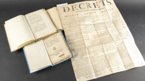 Commune-affranchie.Commune-affranchie, Chez le citoyen Destefanis, An II. In-12, 128 pages, bradel cartonnage moderne. Liste d'environ 1500 à 2000 victimes, avec mentions de leur âge, adresse et profession. - LISTE des contre-révolutionnaires & révoltés de la ci-devant ville de Lyon, condamnés à être fusillés & guillotinés par jugement de la commission militaire [...]. Paris, Toubon, Lefèvre, De l'Imprimerie du Calculateur Patriote, au corps sans tête, l'an deuxième de la république française, une et indivisible, et deuxième de la mort du tyran. In-8, cartonnage du XIXe siècle. Contient la féroce et édifiante Lettre de la guillotine de ci-devant Lyon, à la guillotine de Paris, sa sœur aînée (pp. 2-8) : Je lis avec étonnement, ma chère sœur [...], vos faits miraculeux, vos prouesses admirables, [...]. Je t'envoie ma chère sœur aînée, le détail de mes travaux [...] je taille, je rogne, je découpe les scélérats, & du mouvement d'un poids assez fort, je leur accorde un passeport pour l'autre monde, ainsi que toi. Coiffes arrachées. - DÉCRETS relatifs à Ville-affranchie, avec tous les arrêtés des représentans du peuple, qui ont été pris dans cette commune depuis le 9 octobre. Commune-affranchie, De l'Imprimerie républicaine des Représentans du peuple, An II. In-8, broché. Avec, relié en tête,un rare placard in-folio des trois décrets pris par la Convention nationale au sujet de la ville de Lyon (impression de Commune-affranchie, De l'Imprimerie nationale du département du Rhône, an II) : décrets portant que la ville de Lyon sera détruite & son nom effacé du tableau des villes de la République, relatif à l'administration & à la vente des biens des rebelles Lyonnois, et portant que les conspirateurs de Bordeaux & de Lyon seront renvoyés aux Tribunaux révolutionnaires.