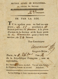 page in-12 (environ 175 x 115 mm). Pièce rare. Tu te rendras avec un fusil ou une pique, le 12 prochain à 11 heures précises du matin à la place d'armes de la Section et de là, au poste de la Commune pour y faire ton service, de 24 heures […].En bas la mention imprimée : La Loi t'oblige à faire ton service en personne. Cet ordre de réquisition est certainement lié aux journées du 9, 10 et 11 thermidor an II (27, 28 et 29 juillet 1794), marquées par la chute de Robespierre, la fin de la Terreur et l'exécution du grand révolutionnaire et de plusieurs robespierristes (71 têtes furent coupées dans la seule journée du 11 thermidor !). La sécurité avait été renforcée dans Paris à la suite de ces événements et à la demande des Thermidoriens (autrement dit les vainqueurs de Robespierre).