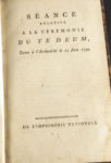 TABLEAUX et détails de l'ordre, de la marche & des cérémonies qui s'observeront dans la fête nationale qui sera célébrée au Champs de Mars, à l'occasion du Pacte Fédératif le 14 juillet 1790, jour de l'anniversaire de la prise de la Bastille. - GRANDEFÉDÉRATION de toutes les gardes nationales et troupes de ligne du royaume, à Paris. - CONFÉDÉRATION NATIONALE (La). Détail exact de cette fête, et de tout ce qui s'est passé dans la journée mémorable du 14 juillet 1790. - DESCRIPTION fidelle de tout ce qui a précédé, accompagné & suivi la cérémonie de la Confédération nationale du 14 juillet 1790. Avec une planche gravée. - FÊTE de la fondation de la République. Programme... [Paris, De l'Imprimerie de la République, Fructidor an VII]. Descriptif des jeux qui s'y dérouleront, dont une expérience aérostatique (Un ballon de neuf à dix mètres de diamètre sera monté par deux aéronautes). Quelques rousseurs, importante mouillure à une plaquette. Reliure frottée.