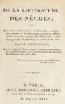 GRÉGOIRE. De la littérature des nègres, ou Recherches sur leurs facultés intellectuelles, leurs qualités morales et leur littérature. Paris, Maradan, De l'Imprimerie des sourds-muets, 1808. In-8, basane marbrée, dos orné d'un gros fer...
