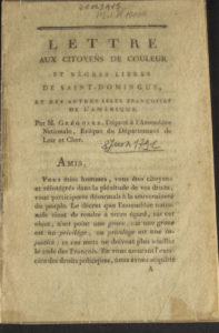 GRÉGOIRE. Lettre aux citoyens de couleur et Nègres libres de Saint Domingue, et des autres îles françoises de l'Amérique. Paris, de l'Imprimerie du patriote François, 1791. Plaquette in-8 de 16 pages, titre de départ, brochée. Édition...