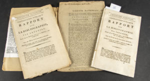 du recensement des livres appartenant à la Nation provenant des châteaux, de la suppression des corporations ecclésiastiques, judiciaires, académique. Dans les bibliothèques, une foule de livres ont été vendus à bas prix, au poids, ailleurs on a dilapidé. Des bibliothèques et des musées formés avec choix sont en quelque sorte les ateliers de l'esprit humain (Monglond, III, 163). On joint une autre édition à la même date de l'Imprimerie de Quiber-Pallissaux, plaquette in-8 de 15 pages, brochée - le n°203 de la Gazette nationale, ou le Moniteur universel, du 12 avril 1794, en feuilles, qui reproduit le texte du rapport.