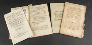 plaquettes in-8 de 30 et 18 pages, déreliées. Éditions originales. Grégoire est constamment préoccupé par la diffusion de l'enseignement technique, particulièrement dans les campagnes, afin d'éviter le retour des famines. On joint : TEISSEIRE (Camille). Observations sur le projet d'établissement d'une métairie nationale dans chaque département, présenté par le citoyen Grégoire au nom du Comité d'Instruction publique. De l'Imprimerie du journal des hommes libres, chez R. Vatar, s.d. Plaquette in-8 de 9 pages. - GRÉGOIRE (l'abbé). Instruction sur les semailles d'automne. Paris, Imprimerie nationale, 1794. Plaquette in-8 de 15 pages. (Deux exemplaires).