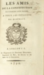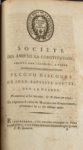 Très important recueil de 145 pièces, en 3 volumes, relatives aux Jacobins et aux sociétés citoyennes et patriotiques affiliées de France. Les deux premiers volumes renferment principalement des discours prononcés aux séances de la Société des Amis de la Constitution de Paris. Parmi les pièces intéressantes se trouvent les discours sur la guerre de Louvet (9 et 18 janvier 1792), Machenaud (29 janvier 1792), Billaud-Varenne (29 janvier 1792) et Sillery (2 février 1792), des textes de Pétion, Dubois de Crancé, Roederer, Louvet, etc. On relève encore : - DUBOIS DE CRANCÉ. Projet de souscription, présenté aux Amis de la Constitution. Le 28 octobre 1790. Paris, De l'Imprimerie nationale, [1790]. Concerne le Serment du jeu de Paume, sa sauvegarde à l'Assemblée nationale et la commande du tableau à David. - LA HARPE. Discours sur la liberté du théâtre, prononcé le 17 décembre 1790. Paris, De l'Imprimerie nationale, [1790]. - BRISSOT. Discours sur la question de savoir si le Roi peut être jugé, prononcé le 10 juillet 1791. Paris, De l'Imprimerie nationale, [1791]. - DUBOIS DE CRANCÉ. Discours sur le veto appliqué par le Roi au décret du 9 novembre 1791, contre les émigrés. Paris, De l'Imprimerie du Patriote François, 1791. - SIMONNE (Jean-Claude). Discours prononcé le 25 décembre 1791. S.l.n.d.Messieurs, ne nous le dissimulons pas, il faut du sang pour cimenter notre liberté naissante et la rendre stable à jamais, puisque l'effusion de sang semble un malheur inévitable attaché à toutes les révolutions politiques. [...] embouchons la trompette guerrière ; que ses sons fassent frémir les tyrans, en ébranlant les trônes du monde ; que les Français courent aux armes ; qu'ils se rallient sous les drapeaux de la liberté. - ROBESPIERRE (Maximilien). Réponse aux discours de MM. Brissot & Guadet du 25 avril 1792. Paris, De l'Imprimerie de Mayer, [an IV de la Liberté]. - SILLERY. Discours sur les sociétés populaires, et sur la lettre de M. Lafayette au corps législatif dans laquelle ce général accuse la société des Amis de la Constitution de Paris, séante aux Jacobins, d'être la cause des troubles intérieurs. Prononcé le 25 juin 1792. Paris, De l'Imprimerie du Patriote François, [1792]. - DUBOIS DE CRANCÉ. Discours prononcé à la Société des Jacobins. [31 octobre 1792]. [Paris], De l'Imprimerie de Mayer, [1792]. Dénonciation de Marat : Marat, je prononce son nom sans frémir, car bientôt je serai son juge... - FABRE D'ÉGLANTINES. Discours sur le projet d'économat national & sur les moyens d'approvisionner les Armées. S.l., De l'Imprimerie de Potier de Lille, [1793]. - LEPELETIER (Félix). Vie de Michel Lepeletier, représentant du peuple français, assassiné à Paris le 20 janvier 1793.Paris, De l'Imprimerie des Sans-Culottes, [1793]. - [MARAT]. Adresse aux Français.[Paris], De l'Imprimerie patriotique et républicaine, [1793]. Discours du 26 juillet 1793 relatif à la mort de Marat :Un nouveau crime vient encore d'exciter l'indignation des amis de la liberté, de l'égalité et de l'humanité. Les poignards que la discorde aiguisoit dans le Calvados, ont atteint un représentant du peuple ; et le jour est à peine passé, où dans Paris se firent entendre ces sons lugubres : Marat vient d'être assassiné, Marat est mort. Le troisième volume renferme de nombreuses pièces adressées ou émanant de sociétés citoyennes de province, la plupart du temps imprimées dans les villes où elles sont établies, soit environ 25 pièces (extraits de procès-verbaux, règlements, demande d'affiliation, etc.) : Amiens, Ancenis, Besançon (imprimeries Briot et Simard), Bordeaux, Brest (imprimerie Malassis, 1790, 1791 et 1792), Chalons-sur-Saône (imprimerie Delorme Delatour, 1790), Charolles (imprimerie Baudinot), Clermont-Ferrand (imprimerie Denis Limet, 1790), Dijon (imprimerie Causse), Limoges (imprimerie des Amis de la Constitution), Limoux, Lisieux (imprimerie Delaunay), Marseille (imprimerie Rochebrun et Mazet, 1792), Montauban (imprimerie des Amis de la Constitution), Morlaix (imprimerie Guyon), Nantes (imprimerie Hérault, 1793), Poitiers, Pontoise, Rennes (imprimerie Robiquet), Riom (imprimerie Landriot, 1790), Seurre, Versailles (imprimerie Cosson), ou encore Vesoul (imprimerie Poirson, 1794). Ces impressions provinciales publiées sous la Révolution sont très rares. Petits accrocs à quelques coiffes.