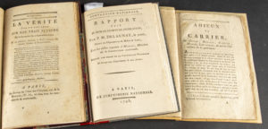 lieu à accusation contre Marat, membre de la Convention nationale ? Paris, De l'Imprimerie nationale, [1793]. Ensemble 2 ouvrages en un volume in-12, bradel demi-maroquin rouge (Honnelaître). - [BOREILLARD]. Adieux de Carrier, à Collot, Billaud, Barrère, Duhem, Levasseur, et autres Chevaliers de la guillotine. S.l., De l'Imprimerie de la Vérité, s.d. Brochure in-12 de 8 pages, couverture papier moderne. [...] je veux reconnoître les services qui m'ont été rendus par mes dignes amis et confrères les buveurs de sang [...]. Pour la conservation de ma mémoire et mes principes, je lègue à la Société-mère des égorgeurs, noyeurs et fusilieurs, séante ci-devant aux Jacobins [...] mon gillet rouge passé en couleur par les tinturiers [sic] Fouquet et Lamberty, dans une des fusillades nantaines. [...] j'invite donc mes braves collègues [...] à beugler, braire, hennir, rugir et hurler chacun suivant ses facultés, aussi-tôt qu'il leur sera proposé de completter la Convention, qu'ils savent n'être pas entière. - [MÉHÉE DE LA TOUCHE]. La Vérité toute entière sur les vrais acteurs de la journée du 2 septembre 1792. Et sur plusieurs journées et nuits secrètes des anciens comités de gouvernement. Paris, Au Bureau de l'Ami des Citoyens, s.d. In-8 de 69 pages, demi-maroquin aubergine avec coins, tête dorée (V. Champs). [...] je croyois la tête du monstre coupée et alors il étoit permis de rire. [...] Robespierre vit encore. Je quitte donc la plaisanterie pour poursuivre sérieusement et tout de bon les oppresseurs de mon pays [...] je dédié mes efforts à la journée du 9 thermidor, source de révélation, toutes les vérités et jugement dernier de tous les crimes.