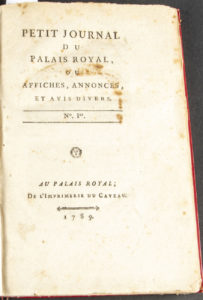 [LECLERC DE SAINT-AUBIN]. Petit journal du Palais royal, ou Affiches, annonces et avis divers. Au Palais royal [Paris], De l'Imprimerie du Caveau, 1789. Ensemble 6 numéros en un volume in-8, bradel toile rouge, pièce de titre noire en long au dos...
