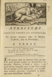 Républicaine]. In-8, bradel cartonnage papier tourniquet, pièce de titre rouge en long au dos (Reliure moderne). Description des atrocités commises sous la Terreur sur des citoyennes détenues dans la maison d'arrêt d'Arras : maltraitance, humiliations, harcèlement moral, attouchements sexuels, etc. On y trouve une liste de détenues mortes à Arras et à Cambrai, ainsi que des pièces justificatives dont les déclarations de nombreuses victimes. Vignette gravée figurant un loup égorgeant une brebis. Manque la page de titre.