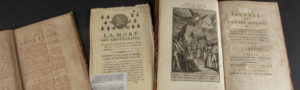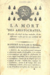 Duchesne & Compagnie, au Tribunal de Pluton. Paris, Toubon, Lefevre, an II ; et à Luciféros, l'an 1780 de tous les Diables. Plaquette in-8 de 31 pages, demi-veau fauve avec coins, dos orné, pièce de titre verte (Reliure de la fin du XIXe siècle). Première partie sur deux, ornée d'un curieux frontispice gravé sur cuivre par Louvion figurant l'Appel au diable par les corps sans têtes. Réparation dans le blanc du titre. - MORT des aristocrates (La), précédée du détail de leur maladie, & des différentes crises qui les ont conduits au tombeau. Rapport de la Faculté de Médecine, consultée sur la maladie des Aristocrates. S.l.n.d. [c. 1790]. Plaquette in-8 de 8 pages, déreliée. En tête du texte, fleuron macabre figurant une tête de mort posée sur deux tibias croisés et entourée de grosses larmes. - LIVRE ROUGE (Le), ou Liste des pensions secrettes [sic] sur le Trésor public, contenant les noms & qualités des Pensionnaires, l'état de leurs services, & des Observations sur les motifs qui leur ont mérité leur traitement. Paris, De l'Imprimerie royale, 1790. 2 fascicules en une plaquette in-8, de 27 et 22 pages, bradel demi-toile vert olive (Pouillet). Deux premières livraisons seules. Texte imprimé en caractères rouges. Quelques pages entièrement roussies. Coiffe supérieure arrachée.