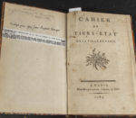 PARIS. - Cahier du tiers-état de la ville de Paris. Paris, Méquignon, 1789. Plaquette in-8 de 69 pages, demi-veau brun (Reliure vers 1860). L'un des plus fameux cahiers, où sont abordés les problèmes de Constitution, finances, agriculture et...