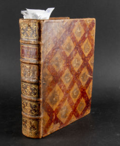 RECUEIL de 14 pièces en un volume in-4, basane décorée sur les plats d'un treillis peint en rouge avec gros point noir au centre de chaque losange, dos orné, pièce de titre rouge, tranches marbrées (Reliure de l'époque). Recueil de 14 pièces...