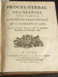 concernant la ville de Lyon au début de la Révolution, les poids et mesures, les assurances vie, les finances et l'économie, parmi lesquels on relève : PROCÈS-VERBAL des séances de la première assemblée provinciale de la généralité de Lyon, tenue à Lyon dans les mois de septembre, novembre & décembre 1787. Lyon, De l'Imprimerie d'Aimé de La Roche, 1787. - PROCÈS-VERBAUX de la proclamation et installation de la municipalité de la ville de Lyon. [Lyon, De l'Imprimerie d'Aimé de La Roche, 1790]. - FERRIÈRES (Jacques-Annibal). Plan d'un nouveau genre de banque nationale et territoriale, présenté à l'Assemblée nationale, par Ferrières, négociant de Lyon. Paris, De l'Imprimerie de Monsieur, 1789. - PRIEUR. Mémoire sur la nécessité et les moyens de rendre uniformes, dans le royaume, toutes les mesures d'étendue et de pesanteur [...]. Dijon, De l'Imprimerie de Causse, 1790. Un tableau dépliant. - Compagnie royale d'assurances. Prospectus de l'établissement des assurances sur la vie. Paris, De l'Imprimerie de Lottin, 1788. - État de la dette publique [...]. Paris, Imprimerie nationale, 1790. Étiquette ex-libris imprimé de la bibliothèque d'Em.-M. F. Rousset. Reliure frottée, une pièce arrachée au dos.