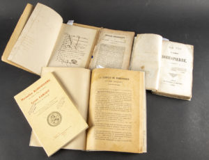 la Société historique et archéologique du Maine, et mention de vente manuscrite. - [LAVOINE]. La Famille de Robespierre et ses origines (1452-1790). S.l.n.d. [vers 1914]. In-8, broché. Épreuve corrigée de cet article paru dans la Revue du Nord de 1914. Avec un arbre généalogique manuscrit. - [CARNET DE ROBESPIERRE]. Reproduction par les procédés héliographiques Motteroz du Carnet de Robespierre trouvé sur lui au moment de son arrestation. S.l.n.d. In-8, broché, dos de toile verte. Rare. - VIE de Maximilien Robespierre (La). Arras, Théry, 1850. In-12, broché. Couverture doublée, dos refait. - LAPONNERAYE. Notice historique sur Maximilien Robespierre. S.l.n.d. [Sceaux, c. 1833]. In-12, broché.