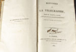 à double page. Ouvrage imprimé à compte d'auteur, célébrant l'invention de la télégraphie par Claude Chappe (1763-1805) en 1791. À partir de Claude Chappe et de ses frères, les dépêches iront à la vitesse de la manipulation des leviers : on passera d'une journée à une heure. Les lignes s'étendront à toute la France d'abord, puis avec les victoires et les conquêtes à l'Allemagne, la Belgique, l'Italie, les Pays-Bas ; la Ruissie s'équipera entre Saint-Pétersbourg et Cronstadt en 1834, les États-Unis entre New York et la Nouvelle-Orléans en 1837 (En français dans le texte, n°238). Plaisant exemplaire en cartonnage de l'époque. Ex-libris manuscrit de l'époque sur le titre : St Paul (pièce de papier rouge en queue avec la même mention).