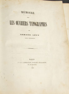 MOUVEMENT OUVRIER. - LÉVY (Armand). Mémoire pour les ouvriers typographes. - Procès des ouvriers typographes. Appendice : la question typographique. - Les Ouvriers typographes en appel. 2e mémoire. Consultations de Mes Odilon Barrot, Marie et...