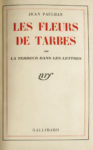 PAULHAN (Jean). Les Fleurs de Tarbes ou la Terreur dans les lettres. Paris, NRF, Gallimard, s.d. [1941]. In-8, demi-chagrin brun, dos lisse portant le titre doré, tête dorée, non rogné, couverture et dos (A. Lobstein). Édition originale. Les...