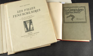 In-8, maroquin rouge, sur les plats grand rectangle de veau noir serti d'un filet doré, le premier portant le titre doré sur deux lignes, dos lisse orné, tête dorée, couverture et dos (Alix). Édition originale, tirée à 315 exemplaires. Exemplaire sur vélin teinté, portant un envoi signé de l'auteur au critique et académicien Émile Faguet (1847-1916). - Les Villes tentaculaires. Paris, Helleu & Sergent, 1919. In-4, en feuilles, en partie non coupées, couverture illustrée rempliée, chemise à lacets. Première édition illustrée, ornée d'une lithographie et de 47 bois gravés de Frank Brangwyn. Tirage à 274 exemplaires, celui-ci un des 20 sur chine. Auréole de mouillure sur le bord des cahiers. Petits manques de papier à la chemise.