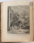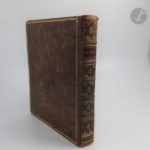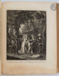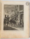 CERVANTES SAAVEDRA (Miguel de). Les Principales avantures de l'admirable Don Quichotte, représentées en figures par Coypel, Picart le romain, et autres habiles maîtres : avec les explications des XXXI Planches de cette magnifique collection, tirées de l'original espagnol de Miguel de Cervantes. La Haye : Pierre de Hondt, 1746. — In-4, veau marbré, triple filet doré en encadrement sur les plats, dos à nerfs orné, tranches dorées (reliure de l'époque). Cohen, 216-217. Une des plus belles éditions illustrées de ce chef-d'œuvre de la littérature espagnole. Elle est ornée d'une vignette sur le titre et d'un bandeau situé en tête de la dédicace, dessinés et gravés par Jacob Van der Schley, ainsi que de 31 planches gravées en taille-douce par Simon Fokke, Bernard Picard, Jacob Van der Schley et Pieter Tanjé d'après François Boucher, Cochin fils, Charles Coypel, Jacques-Philippe Le Bas, Bernard Picart et Trémolières. Exemplaire complet du feuillet final contenant l' « Avis au relieur », qui manque souvent. Charnières en partie fendues, épidermures, griffures et travaux de vers sur les plats et les coins, manques à la coiffe inférieure. Rousseurs, taches sur plusieurs feuillets, quelques travaux de vers dans les marges et sur les gardes, sans atteinte au texte. Provenance : Fabry notaire, avec pièce de maroquin vert foncé portant son nom au bas du dos.