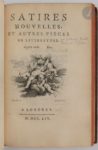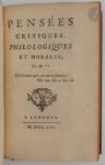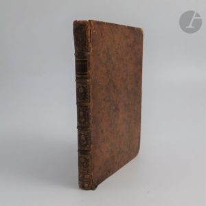 [DU GÉRARD (N. B.)]. Tables alphabétique & chronologique Des pieces Représentées sur l'Ancien Theatre Italien Depuis son Etablissement jusqu'en 1697 qu'il a été fermé. Avec des Remarques sur ces Pieces Et une Table Alphabétique des Auteurs qui ont travaillé pour ce Theatre. Paris : imprimerie de Prault, 1750. — In-8, veau marbré, dos à nerfs orné, tranches rouges (reliure de l'époque). Édition originale très rare de ce fort intéressant ouvrage de l'homme de théâtre N. B. Gérard consacré au théâtre italien. L'ouvrage se compose d'un titre gravé sur cuivre par P.L. Charpentier, d'une épître aux ducs et pairs, d'un avertissement, d'un « abrégé historique sur l'ancien théâtre italien », de huit pages gravées sur cuivre donnant les « Tables alphabétique & chronologique Des pieces Représentées sur l'Ancien Theatre Italien », suivis des « Remarques sur les pièces de l'ancien théâtre italien » et enfin le tableau des « Noms Des Auteurs Qui ont travaillé Pour l'Ancien Théâtre Italien », entièrement gravé sur cuivre sur deux feuillets. Reliés à la suite deux ouvrages du poète et critique d'art Guillaume Baillet de Saint-Julien (1726-1795) : - [BAILLET DE SAINT-JULIEN (Guillaume)]. Satires nouvelles, et autres pièces de littérature. Londres (Paris), 1754. Édition originale de ce recueil, illustrée sur le titre d'une jolie vignette gravée sur cuivre par Goopil d'après un dessin de Bouché. - [BAILLET DE SAINT-JULIEN (Guillaume)]. Pensées critiques, philologiques et morales, Par M. **. Londres, 1754. Édition originale. Manque à la coiffe de tête, fentes à la charnière du premier plat, craquelures à celle du second, coins émoussés