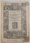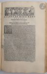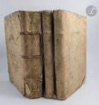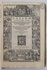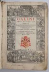 GALIEN. Omnia quae extant opera. Venise : Juntas, 1550. — 5 parties (sur 10) en trois volume in-folio, parchemin rigide, dos à nerfs (reliure de l'époque). Seconde édition de cette version des œuvres de Galien, publiée en latin par les soins du médecin et traducteur italien Augustinus Gadaldinus (1515-1575). La première parut en 1541-42. L'ouvrage est composé à l'origine de dix parties, chacune avec un titre propre et une foliotation particulière, mais sans mention d'ordre. Nous n'avons ici que cinq de ces dix parties, à savoir la première, la seconde, la cinquième, la neuvième et la dixième. Il manque également l'index publié en 1551 par Antonio Musa Brasavola. Chaque titre est illustré d'un bel encadrement historié gravé sur bois, représentant huit scènes de la vie de Galien, qui avait déjà été utilisé pour l'édition de 1541-42. Le premier titre est le seul à être imprimé en noir et rouge et à comporter les armes du dédicataire, le cardinal Giovanni Salviati, imprimé en rouge avec rehauts de bleu et de jaune. À l'intérieur, l'illustration ne comprend que de jolis ornements plusieurs fois répétés. Reliures défraîchies, surtout celle du premier volume, avec déchirures et manques. Dos anciennement refaits. Déchirure sans manque au titre de la seconde partie. Quelques mouillures claires, rousseurs éparses. Petites galeries de vers sans gravité. Manque le dernier feuillet blanc de la seconde partie (V6). Déchirure avec atteinte au texte au feuillet 60 de la neuvième partie (Extra ordinem classium).