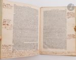 GUICCIARDINI (Lodovico). Commentarii di Lodovico Guicciardini Delle cose più memorabili seguite in Europa : specialmente in questi paesi bassi, dalla pace di Cambrai, del M. D. XXIX. insino a tutto l'Anno M. D. LX. Venise : Domenico Farri, 1566. — In-4, parchemin rigide, dos lisse, tranches bleues (reliure du XVIIIe siècle). Troisième édition dédiée au grand duc de Florence et de Sienne, de cet ouvrage de l'écrivain et historien florentin Lodovico Guicciardini (1521-1589). L'auteur raconte dans trois parties les choses les plus mémorables qui se sont passées en Europe, essentiellement aux Pays-Bas, depuis la paix de Cambrai en 1529 jusqu'en 1560. Les deux précédentes éditions parurent en 1565, à Venise et à Anvers. Bon exemplaire en reliure italienne du XVIIIe siècle. Il est enrichi de nombreuses notes manuscrites portées dans la marge par un lecteur italien du XVIe siècle. Quelques rares traces de mouillures claires, rousseurs éparses. Restauration à l'angle inférieur du feuillet A2, avec atteinte à un mot. Les notes manuscrites ont été légèrement coupées par le relieur. Provenance : Le Gonidec de Traissan, avec ex-libris du XIXe siècle.