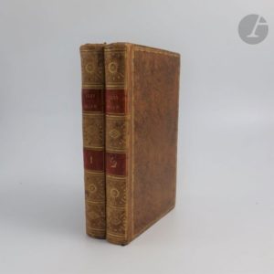 KEATE (George). Relation des îles Pelew, situées dans la partie occidentale de l'océan Pacifique ; Composée sur les Journaux et les communications du Capitaine Henri Wilson et de quelques-uns de ses Officiers, qui, en août 1783, y ont fait naufrage sur l'Antelope, paquebot de la Compagnie des Indes orientales. Paris : Maradan, 1793. — 2 volumes in-8, veau havane raciné, roulette dorée en encadrement sur les plats, dos lisse orné, tranches marbrées (reliure de l'époque). Nouvelle édition de la traduction française de cette relation composée par l'écrivain et poète George Keate (1729-1797). Elle est ornée d’un portrait du capitaine Wilson gravé par Sophie Massard d'après Russell, d’une carte dépliante des îles Pelew, et de 15 planches, dont 12 dépliantes, gravées en taille-douce notamment par De Gouy, Pierre François Tardieu, Miss Kent d'après Devis ou encore S. Jouan. Dos légèrement passés, quelques épidermures. Mouillure sur plusieurs feuillets et planches, surtout dans le premier volume.