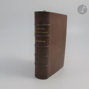 [LETI (Gregorio)]. Histoire des conclaves Depuis Clement V jusqu'à présent. Enrichie De plusieurs Memoires, qui contiennent l'Histoire du Pape & des Cardinaux d'aujourd'hui, & celle des principales Familles de Rome ; où l'on apprend quantité de Particularité de cette Cour. Avec Un Discours qui explique toutes les cérémonies qui s'observent depuis la mort du Pape, jusqu'après l'élection de son Successeur… Cologne, 1703. — 2 tomes en un volume in-12, maroquin havane janséniste, dos à nerfs, dentelle dorée intérieure, tranches dorées sur marbrures (Trautz-Bauzonnet). Cette édition, bien que notée comme la troisième sur le titre, est en réalité la quatrième en français, établie par le baron de Huyssen ou Casimir Freschot (v. 1640-1720) bénédictin de la congrégation de S.-Vanne. L'ouvrage parut pour la première fois en italien en 1667 et la première version en français fut donnée par Jean Vanel et publiée en 1689. Celle-ci est enrichi, avec une pagination séparée, du conclave ce Clément XI et d'un traité de l'origine des cardinaux et des légats. Dans cette partie, les pages des 12 feuillets composant le cahier *E sont paginées 99 à l'exception de la dernière paginée 100. L'illustration est composée d'un frontispice, de deux belles planches dépliantes, la première représentant le plan et une vue du conclave, et la seconde une procession, ainsi que de 14 vignettes gravées sur cuivre dans le texte. Très bel exemplaire relié par Trautz-Bauzonnet pour le capitaine d'État-Major de l'armée française, historien et bibliophile Eugène-Gabriel Marigues de Champ-Repus (1828-1892). Griffures sur le bord du premier plat. Provenance : Eugène-Gabriel Marigues de Champ-Repus, avec ex-libris.