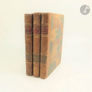 WINCKELMANN (Johann-Joachim). Histoire de l'art de l'Antiquité. Leipzig : l'auteur, Jean Gottl. Imman. Breitkopf, 1781. — 3 volumes in-4, demi-veau havane à coins, dos à nerfs, tranches marbrées (reliure de l'époque). Première édition de la seconde traduction française donnée par l'homme de lettres Michael Huber (1727-1804), de ce livre capital, considéré comme l’encyclopédie des arts du dessin dans l’antiquité. Winckelmann, écrivain et archéologue allemand, est considéré comme l'un des fondateurs de l’histoire de l’art moderne. La doctrine qu’il défend est la suivante : « le seul moyen que nous ayons d'être grands, voire inimitables si c'est possible, est d'imiter les Anciens. » Il prône une connaissance des objets et des œuvres antiques par rapport à l'étude du contexte social, religieux ou climatique qui les a vu naître. Tous ses travaux ont révolutionné les études archéologiques, car ils donnaient un cadre pour une classification des œuvres antiques fondée sur une évolution stylistique. Cette « Histoire de l'Antiquité » est sans conteste son œuvre maîtresse. Elle parut pour la première fois en français en 1766, mais la traduction déplut à l'auteur. Cette édition de 1781 débute par une importante préface et surtout une longue biographie de l'auteur. Elle est illustrée d'un frontispice gravé par Adam Friedrich Oeser (1717-1799), de 3 vignettes de titre, de 27 bandeaux et de 27 culs-de-lampe gravés entre autres par Christian Gottlieb Geyser (1742-1803) et Medardus Thoenert (1754-1814). L'épître à Léopold-Frédéric-François prince d'Anhalt-Dessau a été ici placée entre les pages CLXXXVI et CLXXXVII. Restaurations aux dos, gardes renouvelées. Partie supérieure du faux titre du premier volume découpée et restaurée. Signature biffée sur les titres. Rousseurs et feuillets brunis. Quelques rares mouillures. Quelques annotations au crayon en anglais. Provenance : G. Woods, avec signature sur le titre des volumes 1 et 3. - James Whittle, avec ex-libris.