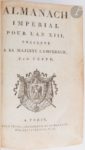 [ALMANACHS IMPÉRIAUX]. Ensemble de sept almanachs impériaux : - Almanach impérial, pour l'an XIII, présenté à S. M. l'empereur et roi, Par Testu. Paris : Testu, [1805]. — In-8, basane marbrée, dos lisse orné, tranches mouchetées (reliure de l'époque). Reliure restaurée, dos rapporté. Mouillures claires aux premiers feuillets. Rousseurs éparses. - Almanach impérial, pour l'année M. DCCC. VI, présenté à S. M. l'empereur et roi, Par Testu. Paris : Testu et Cie, [1806]. — In-8, basane marbrée, dos lisse orné (Favre-Petit-Mermet). Exemplaire en reliure moderne. Traces de scotch et restaurations au titre et au dernier feuillet. Rousseurs. - Almanach impérial, an bissextil M. DCCC. VIII, présenté à S. M. l'empereur et roi, Par Testu. Paris : Testu, [1808]. — In-8, demi-basane marbrée, dos lisse orné, tranches mouchetées (reliure moderne). Exemplaire en reliure moderne. Rousseurs éparses. - Almanach impérial, pour l'année M. DCCC. IX, présenté à S. M. l'empereur et roi, Par Testu. Paris : Testu et Cie, [1810]. — In-8, basane marbrée, dos lisse orné (Favre-Petit-Mermet). Exemplaire en reliure moderne. Rousseurs éparses. - Almanach impérial, pour l'année M. DCCC. X, présenté à S. M. l'empereur et roi, Par Testu. Paris : Testu et Cie, [1809]. — In-8, basane marbrée, dos lisse orné, tranches mouchetées (reliure de l'époque). Travaux de vers sur le bord du second plat, quelques défauts d'usage. Rousseurs éparses. - Almanach impérial, pour l'année M. DCCC. XI, présenté à S. M. l'empereur et roi, Par Testu. Paris : Testu et Cie, [1811]. — In-8, basane racinée, roulette dorée en encadrement sur les plats, dos lisse orné (reliure de l'époque). Rousseurs. - Almanach impérial, pour l'année M. DCCC. XIII, présenté à S. M. l'empereur et roi, Par Testu. Paris : Testu et Cie, [1813]. — In-8, basane racinée, dos lisse orné, tranches mouchetées (reliure de l'époque). Reliure habilement restaurée. Rousseurs.