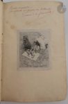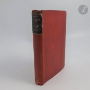 BONNIÈRES (Robert de). Jeanne Avril. Roman parisien. Paris : Paul Ollendorff, 1887. — In-18, percaline rouge à la Bradel, dos lisse, non rogné, couverture conservée (Pierson). Édition originale. UN DES 25 EXEMPLAIRES NUMÉROTÉS SUR PAPIER DE HOLLANDE. Exemplaire d'Edmond de Goncourt, enrichi de cet envoi autographe signé de l'auteur sur le faux -titre : « A mon cher maître Ed. de Goncourt // Robert de Bonnières. » Edmond de Goncourt a ajouté cette note autographe à l'encre rouge sur la première garde : « Edition originale // Exemplaire sur papier de Hollande // Edmond de Goncourt. » On y trouve également son célèbre ex-libris réalisé par Gavarni. Salissures à la reliure, manques à la pièce de titre, coins émoussés. Salissures à la couverture et à quelques feuillets. Rares rousseurs. Provenance : Edmond de Goncourt, avec envoi de l'auteur et ex-libris (vente 1897, n° 169).