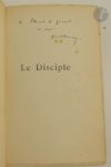 BOURGET (Paul). Le Disciple. Paris : Alphonse Lemerre, 1889. — In-16, percaline rouge à la Bradel, dos lisse, non rogné, couverture conservée (Pierson). Édition originale de l'œuvre majeure de Paul Bourget. EXEMPLAIRE D'EDMOND DE GONCOURT, enrichi de cet envoi autographe signé de l'auteur sur le faux titre : « à Edmond de Goncourt // son dévoué // Paul Bourget. » Goncourt a écrit cette note en l'encre rouge sur la première garde : « Edition originale // Edmond de Goncourt. » Dos légèrement noirci. Rousseurs éparses. Provenance : Edmond de Goncourt, (vente 1897, n° 180).