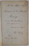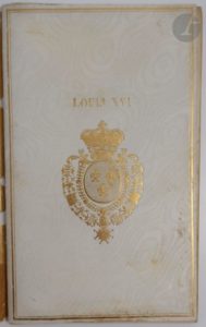BURION (Amédée). Louis XVI martyr dans sa royauté, dans sa famille, dans sa foi. Éloge funèbre. Paris : Charles Petit, 1854. — In-8, cartonnage papier blanc, double filet doré en encadrement sur les plats, armes royales surmontées du nom LOUIS XVI au centre du premier plat, dos lisse, tranches dorées (cartonnage de l'éditeur). Édition originale rare de ce texte de l'auteur dramatique, librettiste et parolier Amédée Burion (18..-1900). Exemplaire du comte de Chambord, enrichi de cet envoi autographe signé de l'auteur sur le premier feuillet : « A son Altesse Royale, // Monseigneur le Cte de Chambord // Hommage // de son très-humble et // très respectueux // serviteur et Sujet, // Am. Burion // Paris. // Ce 3 Mai 1854. » Quelques taches sur les plats. Corps d'ouvrage détaché du cartonnage. Rousseurs. Trou de ver aux deux derniers feuillets et à la dernière garde.