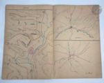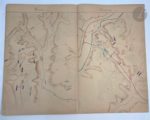 CROQUIS D'HISTOIRE MILITAIRE. 1854-1888. Manuscrit in-folio, broché. Beau manuscrit réalisé en 1887-1888 par un certain A. de Buyas (?), composé d'un titre calligraphié en bleu, et de 38 cartes et plans en couleurs, chacun signé par l'artiste. Ces dessins se rapportent à des batailles historiques depuis 1854 à 1888. On y retrouve ainsi les références suivantes : L'Alma (20 septembre 1854), Inkermann (5 novembre 1854), Campagne d'Italie 1859, Montebello (20 mai 1859), Magenta (21 juin 1859), Solferino (24 juin 1859), Mexique (croquis général des opérations 1861-1869), Guerre de sécession aux États-Unis, Spicherin (6 août 1870), etc. Piqûres et salissures à la couverture. Déchirures au dos.