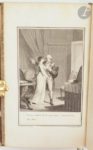 GOETHE (Johann Wolfgang von). Les Souffrances du jeune Werther. Traduction nouvelle. Paris : imprimerie de P. Didot l'aîné, 1809. — In-8, veau marbré, roulette dorée en encadrement sur les plats, dos lisse orné, tranches marbrées (reliure de l'époque). Seconde édition de la traduction française par Henri Huchet, comte de La Bédoyère (1782-1861), du premier roman de Gœthe dont le succès à l'époque de sa sortie en 1774 fut immense. La première version française fut publiée en 1776, dans la traduction du baron Karl Siegmund de Seckendorf. Se succédèrent d'autres traductions françaises dont l'une des plus estimées était celle de La Bédoyère, qui parut pour la première fois en 1804. L'édition est illustrée de trois planches gravées sur cuivre d'après Moreau le jeune. Exemplaire en reliure de l'époque, enrichi d'un portrait du jeune Werther gravé d'après une peinture de Boilly. Il s'agirait en vérité du portrait du fils du peintre. Traces blanches sur la reliure, petite fente aux charnières. Coins émoussés avec manques. Rousseurs éparses.