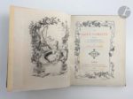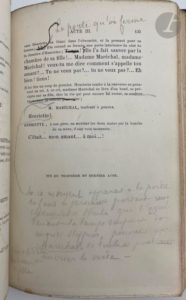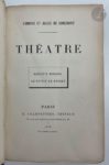 GONCOURT (Edmond et Jules). Théâtre. Henriette Maréchal. La Patrie en danger. Paris : G. Charpentier, 1879. — In-12, percaline bleue à la Bradel, dos lisse, non rogné, premier plat de couverture conservé (Henry-Joseph). Première édition collective du théâtre des Goncourt. Précieux exemplaire d'Edmond de Goncourt, destiné aux corrections. Il porte sur la première garde cette indication autographe à l'encre rouge : « Exemplaire pour correction // E. de Goncourt » et sur la couverture cette autre note autographe : « Exemplaire de l'auteur. » Il ne comprend que de très rares corrections (pp. 76, 110, 124, 126, 127, 129, 135) et ne possède pas la préface d'Edmond Goncourt. Bon exemplaire en reliure de Pierson. Premier plat de couverture seul conservé, bruni et déchiré avec manque sur le bord inférieur. Quelques rousseurs éparses. On joint, d'Edmond de Goncourt : - La Saint-Huberty d'après sa correspondance et ses papiers de famille. Paris : E. Dentu, 1882. — In-12, percaline ocre à la Bradel, dos lisse, non rogné, couverture conservée (E. Carayon). Édition originale illustrée d'un frontispice dessiné et gravé par Adolphe Lalauze, d'une tête de chapitre et d'un cul-de-lampe, gravés à l'eau-forte par Henriot. Le texte est en outre orné d'encadrements dessinés par Pallandre et gravés par Méaulle. UN DES 25 EXEMPLAIRES SUR CHINE, comprenant deux états du frontispice et un fac-similé d'une lettre de Mme Saint-Huberty, relié à la fin. Salissures à la reliure et à la couverture. Quelques rousseurs éparses.