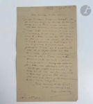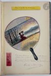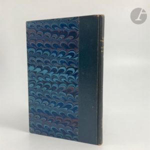 HERVILLY (Ernest d'). La Belle Saïnara. Comédie japonaise en un acte en vers. Paris : Alphonse Lemerre, 1876. — In-18, demi-maroquin bleu à la Bradel, dos lisse, tête rouge, non rogné, couverture conservée (Franz). Édition originale de cette petite comédie représentée pour la première fois sur le théâtre national de l'Odéon en novembre 1876. Elle se termine sur un chanson intitulée « La Jonque des amants », sur une musique d'Armand Gouzien. EXEMPLAIRE DE JULES CLARETIE, enrichi de cet envoi autographe signé de l'auteur sur le faux titre : « mon cher Claretie, je // t'envoie cette gaîté orientale // E. d'Hervilly. » Il a été ajouté, reliée en tête, une aquarelle originale de l'auteur accompagnée d'un quatrain autographe signé, en rapport avec la pièce, ainsi qu'une L.A.S. de l'auteur, le 29 décembre 1878, une page in-8, adressée à un artiste. Frottements aux coiffes et au dos. Provenance : Jules Claretie, avec envoi autographe signé. - Jules Couet, bibliothécaire-archiviste de la Comédie-française, avec ex-libris.