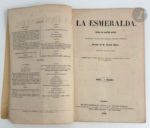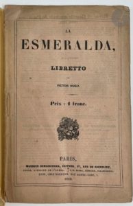 HUGO (Victor). La Esmeralda. Opéra en quatre actes, musique de Mademoiselle Louise Bertin, Paroles de M. Victor Hugo. Décors de MM. Philastre et Cambon. Paris : Maurice Schlesinger, Jonas, N. Barba ; Lyon : Nourtier, 1836. — In-8, broché, sous chemise rigide à dos de toile grise et étui modernes. Édition originale rare de ce libretto inspiré par « Notre-Dame de Paris ». La musique était l'œuvre de Louise Bertin, fille du directeur du « Journal des débats » et élève de Berlioz. Exemplaire broché, tel que paru, complet des deux catalogues à la fin. Comme souvent il manque le frontispice de Célestin Nanteuil. Bon exemplaire malgré des déchirures avec manques aux coins et au dos de la couverture.
