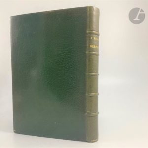 HUGO (Victor). Hernani. Drame en cinq actes. Paris : Librairie L. Conquet, 1890. — Grand in-8, maroquin vert foncé janséniste, dos à nerfs, six filets dorés à l'intérieur, tranches dorées sur témoins, couverture conservée (Ch. De Samblanx, 1913). Belle édition de luxe tirée à 500 exemplaires, illustrée d'un portrait de l'auteur d'après Devéria et de 15 compositions, dont 5 hors texte, gravées à l'eau-forte par Léon Boisson d'après les compositions du peintre et dessinateur espagnol Arturo MICHELENA (1863-1898). Un des 350 exemplaires numérotés sur vélin du Marais, ne comprenant qu'un état des eaux-fortes. Bel exemplaire relié par Charles de Samblanx. Dos légèrement passé et quelques petits frottements d'usage.
