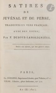 *JUVÉNAL - PERSE. Satires de Juvénal et de Perse, traduites en vers français, avec des notes ; Par F. Duboys-Lamolignère. Paris : Ch. Pougens, Colas, An IX (1801). — In-8, 196 x 123 : (2 ff.), XXIV, 197, x, 39 pp., (1 f. blanc). Maroquin rouge, roulette dorée en encadrement sur les plats, dos lisse orné, monogramme PB doré en queue, roulette dorée intérieure, tranches dorées (reliure de l'époque). Première édition, dédiée à Bonaparte premier consul, de la traduction donnée par Dubois de Lamolignière, ancien conseiller au conseil supérieur de Saint-Domingue, des Satires de Juvénal et de Perse. L'ouvrage possède également une intéressante préface et des notes pour chaque satire. EXEMPLAIRE DE JOSÉPHINE, IMPÉRATRICE DES FRANÇAIS (1763-1814), avec le monogramme PB en queue du dos, provenant de la Malmaison. Ce monogramme PB apparut vers 1798. Sa signification fit beaucoup parler, c'est ce que rapporte Anne Lamort dans le catalogue de la vente Gérard Souham en 2008 : « Une analyse récente en proposait une lecture nouvelle : l'association B et P aurait été un message politique codé jouant avec les mots Buona Parte, le Bon Parti (Cf. Livres précieux du Musée de la Malmaison, pp. 63-66). Quoiqu'intellectuellement plaisante, cette analyse semble indéfendable, si l'on s'en tient à la stricte présentation du chiffre : le P placé avant le B renvoie naturellement aux noms accolés de Joséphine avant et après son mariage Pagerie Bonaparte… Selon Mouravit, in Napoléon bibliophile, ce monogramme aurait été inspiré par un lot de volumes offert par Pauline à son frère lors de son départ pour l'Égypte. Ces volumes étaient frappés au dos des initiales de Pauline Bonaparte et auraient constitué le noyau de la bibliothèque de la Malmaison » (Anne Lamort, in : « Collection Gérard Souham », vente du 7 décembre 2008, n° 21). Exemplaire sur papier vélin, très bien conservé malgré de discrètes et habiles restaurations aux coins et un petit manque sur le bord supérieur du premier plat. Provenance : A. Roux, à Montbéliard, avec ex-libris.