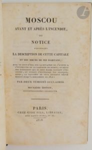 [LECOINTE DE LAVEAU (Georges)]. Moscou avant et après l'incendie, ou notice contenant la description de cette capitale et des mœurs de ses habitans ; avec un coup-d'œil sur la situation de l'Europe à l'ouverture de la campagne de Russie ; le récit des évènemens qui se sont passés pendant l'incendie, et durant l'occupation des français ; enfin, la relation de leur retraite depuis Moscou jusqu'à Kœnisberg e, 1812 ; Par deux témoins oculaires. Paris : Gide fils, 1818. — In-8, veau granité, roulette dorée en bordures des plats, dos à nerfs orné, roulette dorée intérieure, tranches marbrées (reliure de l'époque). Seconde édition augmentée de cet ouvrage de Georges Lecointe de Laveau, secrétaire de la Société impériale des naturalistes de Moscou. L'originale parut en 1814. Nous trouvons ces précisions dans la préface : « En publiant cet Ouvrage, le but des éditeurs est de faire connoître davantage une nation qui a étonné l'Europe par un acte éclatant de patriotisme, par la générosité de son Souverain et par la discipline de ses armées. […] Il est temps de reconnoître les progrès immenses de la Russie vers la civilisation ; ils sont d'autant plus remarquables, que par sa position géographique, elle a dû en faire tous les frais. Les Russes durent étudier les langues étrangères pour entrer en relation avec les autres peuples de l'Europe ; il a fallu qu'ils fissent taire l'orgueil national, pour adopter comme ils l'ont fait, tout ce qui leur a paru meilleur chez les étrangers que chez eux. » Très bel exemplaire en reliure de l'époque. Il est complet du catalogue de l'éditeur à la fin. Rousseurs.