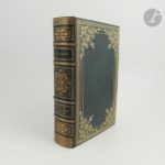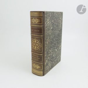 LESAGE (Alain René). Histoire de Gil Blas de Santillane. Paris : Paulin, 1835. — Grand in-8, maroquin gris anthracite à long grain, filets dorés en encadrement et arabesques dorées aux angles sur les plats, dos à nerfs orné dans le même esprit, multiples filets dorés en encadrement à l'intérieur, doublures et gardes de soie moirée grise, tranches dorées sur témoins, couverture et dos conservés, chemise à dos et bandes à recouvrement de maroquin gris anthracite, étui (Huser). Un des plus beaux livres illustrés romantiques, orné d’un portrait de Gil Blas sur chine en frontispice, et de plus de 450 vignettes, le tout gravé sur bois d’après Jean Gigoux dont c’est la principale production, qui lui permit de connaître une grande notoriété. Cette édition est véritablement importante dans l’histoire du livre, car plus qu’une « rénovation », comme le dit Carteret, elle a donné une véritable « impulsion » dans le monde de l’édition. Elle fut en effet la première production illustrée de gravures sur bois à connaître un vaste succès commercial qui poussa les autres libraires à s’arracher les graveurs et à publier par la suite les nombreuses et belles éditions romantiques que l’on connaît. Aux quelques 450 vignettes de Gigoux, s’ajoute une centaine de lettrines formant de véritables petits tableaux. Certaines sont de Gigoux, mais celles à motif naturaliste sont dues à Louis Français, alors élève de Gigoux, qui allait devenir l’un des illustrateurs les plus réputés de l’époque romantique. Superbe exemplaire relié sur brochure par Huser, complet des plats et du dos de la couverture générale datée de 1836. Il est enrichi du prospectus de parution de cette édition, relié à la fin ainsi que de celui, non relié, du « Diable boiteux ». Dos de la chemise passé.