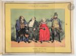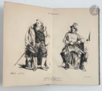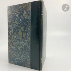 MONNIER (Henry). La Famille improvisée, scènes épisodiques. Paris : J. N. Barba, 1831. — In-8, demi-maroquin vert foncé à la Bradel, dos lisse, tête rouge, couverture conservée (Franz). Édition originale de cette pièce représentée pour la première fois le 5 juillet 1831 sur la scène du théâtre national du Vaudeville. Exemplaire enrichi d'un reçu autographe signé de l'auteur pour une lithographie, et de 3 lithographies originales dépliantes, l'une en couleurs de Monnier représentant 4 des personnages qu'il interpréta dans la pièce, une en noir d'Eugène Lami, figurant Henry Monnier dans deux de ses personnages, extraite de « L'Artiste », et une dernière en noir également, de Matis, représentant 5 personnages de la pièce, tirée du « Magasin Théâtral ». Frottements aux coiffes.