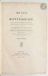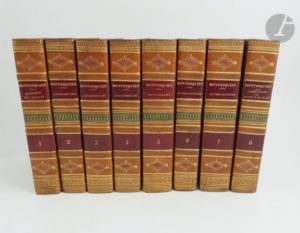 MONTESQUIEU. Œuvres de Montesquieu, ses éloges par d'Alembert et M. Villemain, les notes d'Helvétius, de Condorcet et de Voltaire ; suivies du commentaire sur L'Esprit des lois, par M. le comte Destutt de Tracy. Paris : Dalibon, 1822. — 8 volumes in-8, demi-maroquin citron, chiffre doré au centre du premier plat, dos à nerfs orné de motifs dorés et mosaïqués, non rogné (Dauphin). Belle édition des œuvres de Montesquieu UN DES RARES EXEMPLAIRES SUR PAPIER VÉLIN, en grande partie non coupé, DANS UNE SUPERBE RELIURE DE L'ÉPOQUE SIGNÉE DE PIERRE DAUPHIN, relieur lyonnais qui exerça durant le premier tiers du XIXe siècle. Il manque le fac-similé d'autographe de Montesquieu et le portrait de celui-ci gravé par Müller d'après Deveria. Ils ont été retirés pour être remplacés par un portrait de l'auteur gravé par Pierre-Alexandre Tardieu d'après Antoine-Denis Chaudet (1763-1810) tiré sur chine collé, ainsi que d'une suite de onze planches en état avant la lettre sur chine collé. Rousseurs et quelques rares traces de mouillures. Provenance : chiffre JLR doré sur les plats. - Dr E. F. avec étiquette imprimée collée à l'angle supérieur des contreplats.